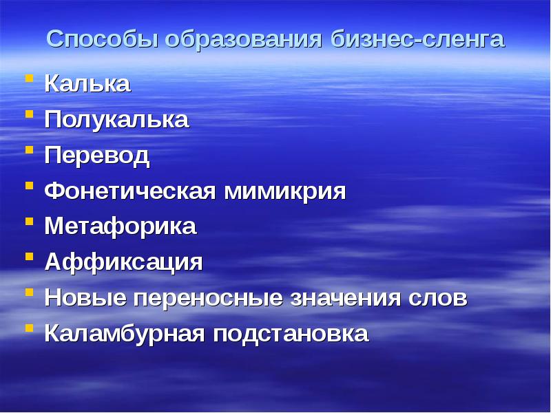 Способы образования бизнес-сленга Калька Полукалька Перевод Фонетическая мимикрия Метафорика Аффиксация Новые переносные значения слов Каламбурная подстановка