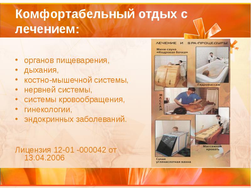 - 5. Комфортабельный отдых с лечением: органов пищеварения, дыхания, костно-мышечной системы,