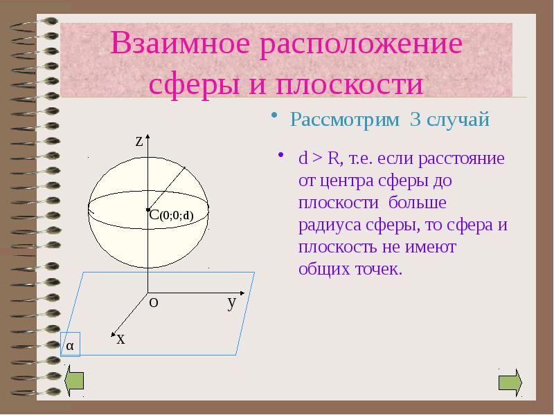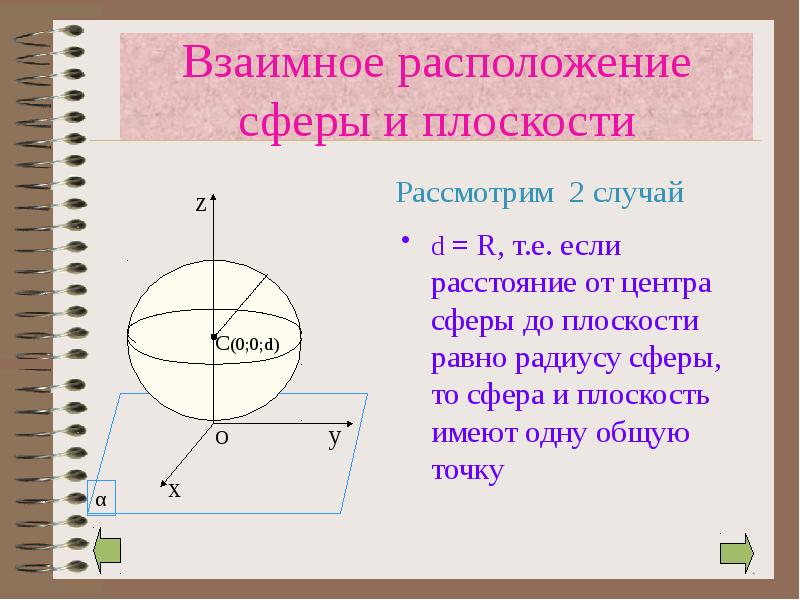 - 12. Взаимное расположение сферы и плоскости В зависимости от соотношения d и