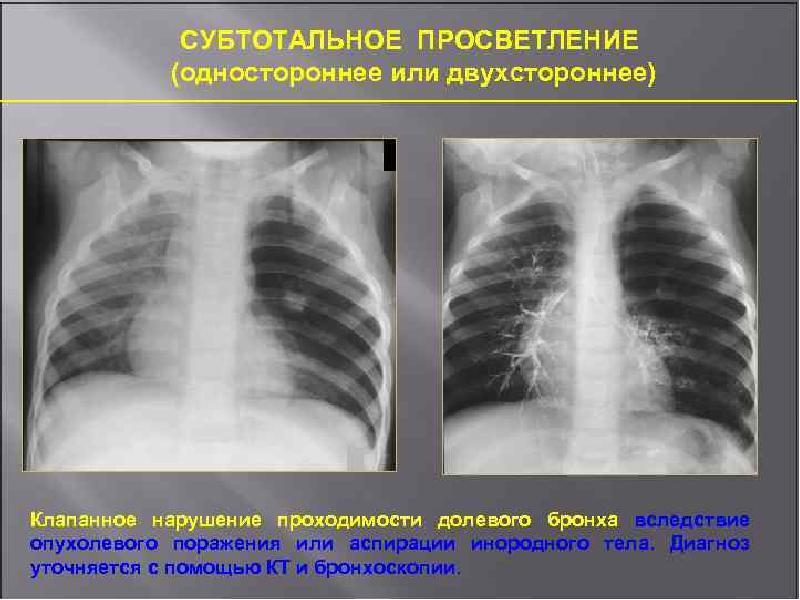 - 9. Субтотальное одностороннее просветление наблюдается при клапанном нарушении проходимости долевого бронха в