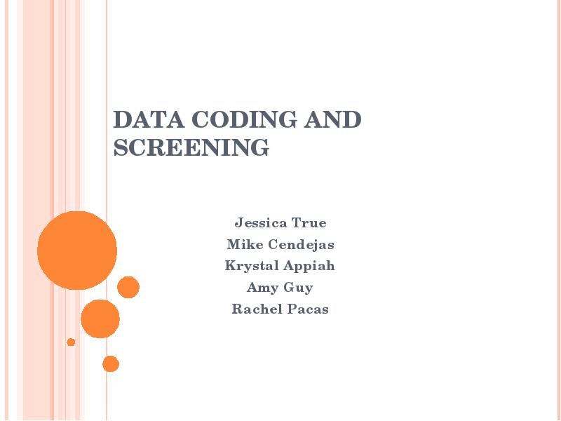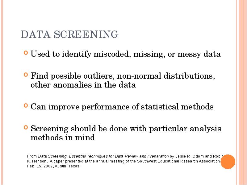 - 7. DATA SCREENING Used to identify miscoded, missing, or messy data Find