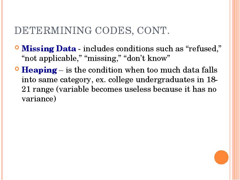 - 11. DETERMINING CODES, CONT. Missing Data - includes conditions such as “refused,”