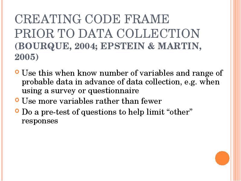 - 12. CREATING CODE FRAME PRIOR TO DATA COLLECTION (BOURQUE, 2004; EPSTEIN &
