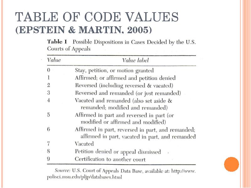 - 13. TABLE OF CODE VALUES (EPSTEIN & MARTIN, 2005)