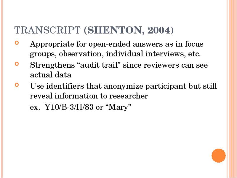 - 14. TRANSCRIPT (SHENTON, 2004) Appropriate for open-ended answers as in focus groups,