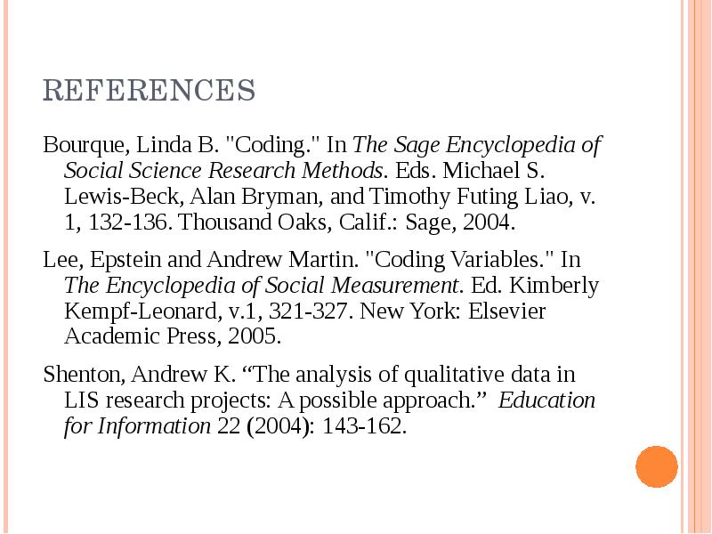 - 18. REFERENCES Bourque, Linda B. "Coding." In The Sage Encyclopedia of Social