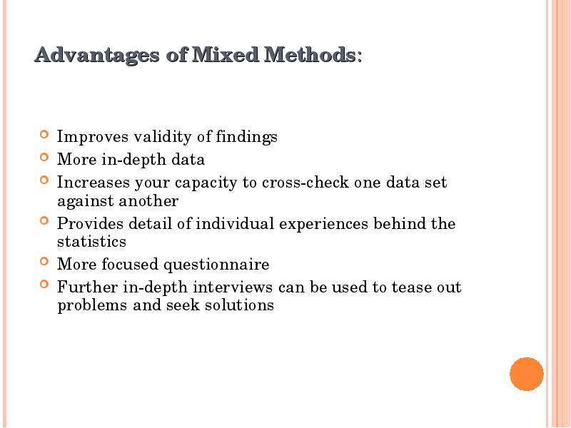 - 23. Advantages of Mixed Methods: Improves validity of findings More in-depth data