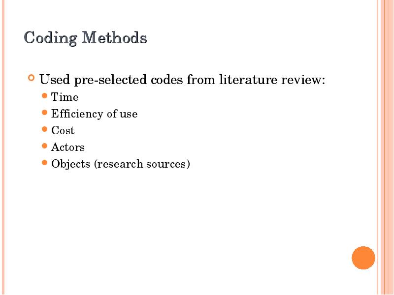 - 30. Coding Methods Used pre-selected codes from literature review: Time Efficiency of