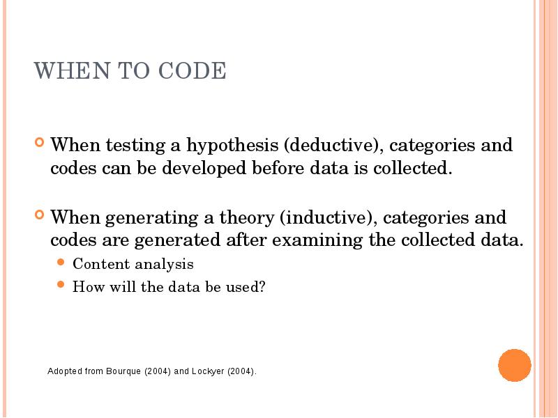 - 4. WHEN TO CODE When testing a hypothesis (deductive), categories and codes