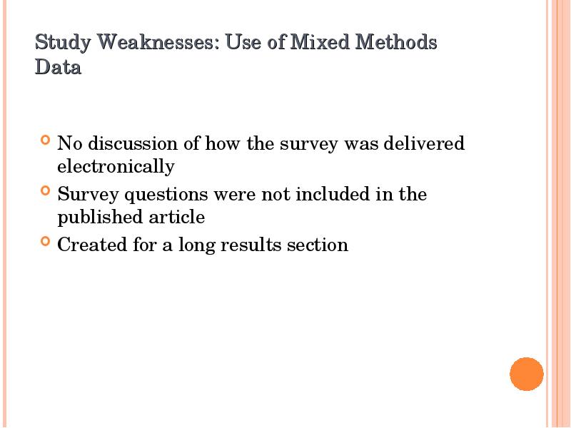 - 34. Study Weaknesses: Use of Mixed Methods Data No discussion of how