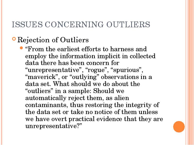- 39. ISSUES CONCERNING OUTLIERS Rejection of Outliers “From the earliest efforts to