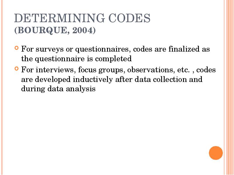- 8. DETERMINING CODES (BOURQUE, 2004) For surveys or questionnaires, codes are finalized
