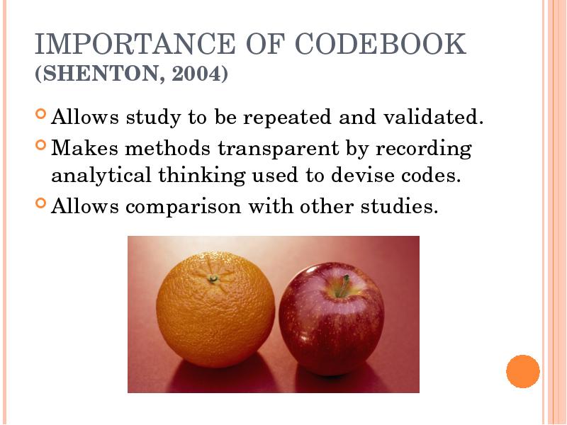 - 9. IMPORTANCE OF CODEBOOK (SHENTON, 2004) Allows study to be repeated and