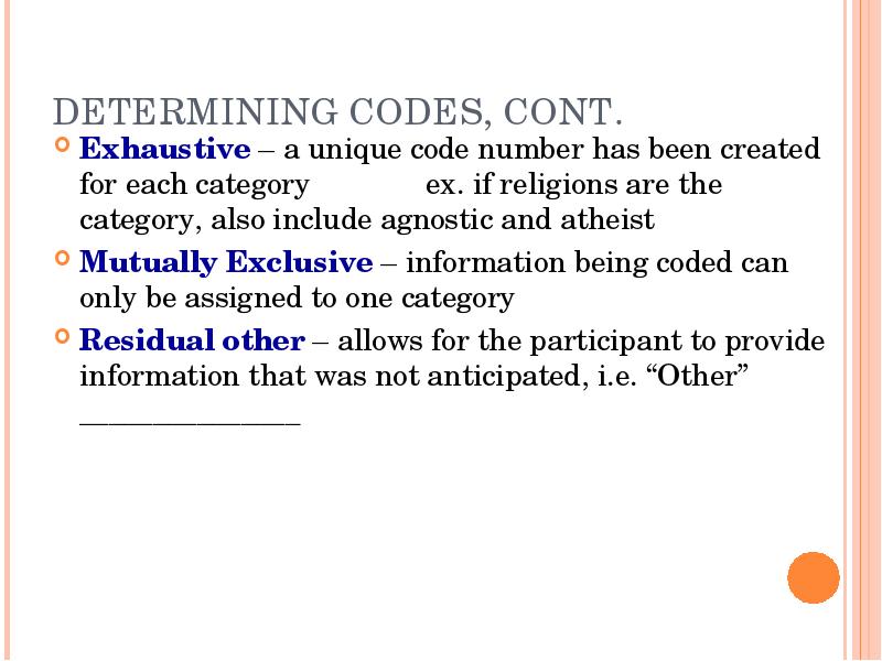 - 10. DETERMINING CODES, CONT. Exhaustive – a unique code number has been