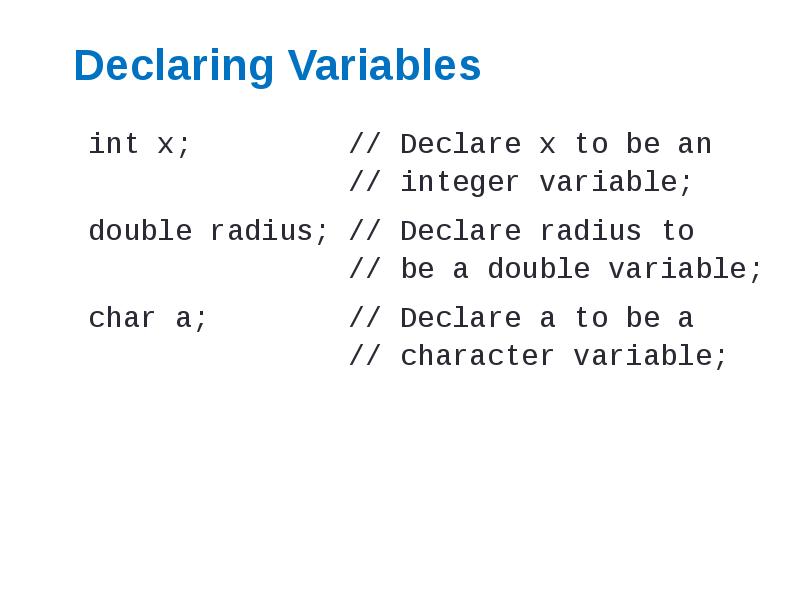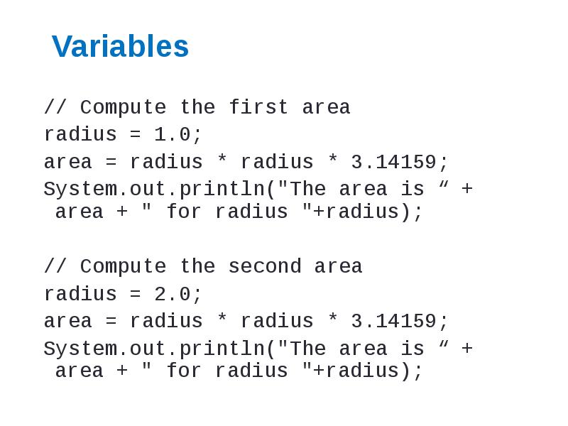 - 11. Variables // Compute the first area radius = 1.0; area =
