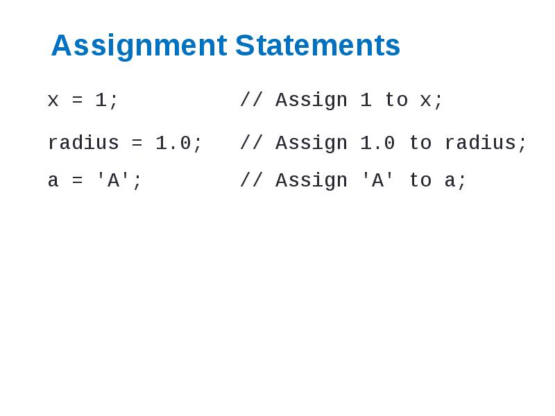 - 13. Assignment Statements x = 1; // Assign 1 to
