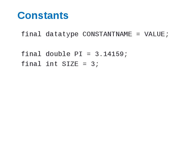 - 15. Constants final datatype CONSTANTNAME = VALUE; final double PI =