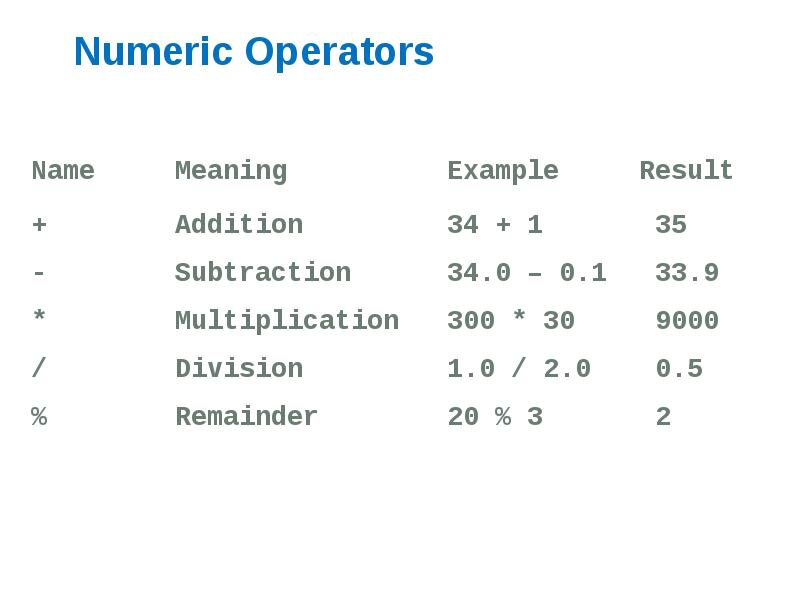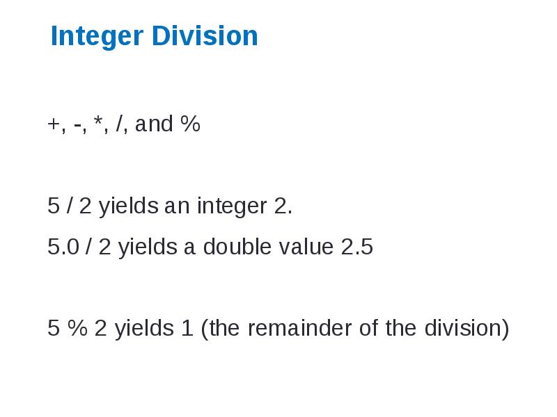 - 18. Integer Division +, -, *, /, and % 5 / 2