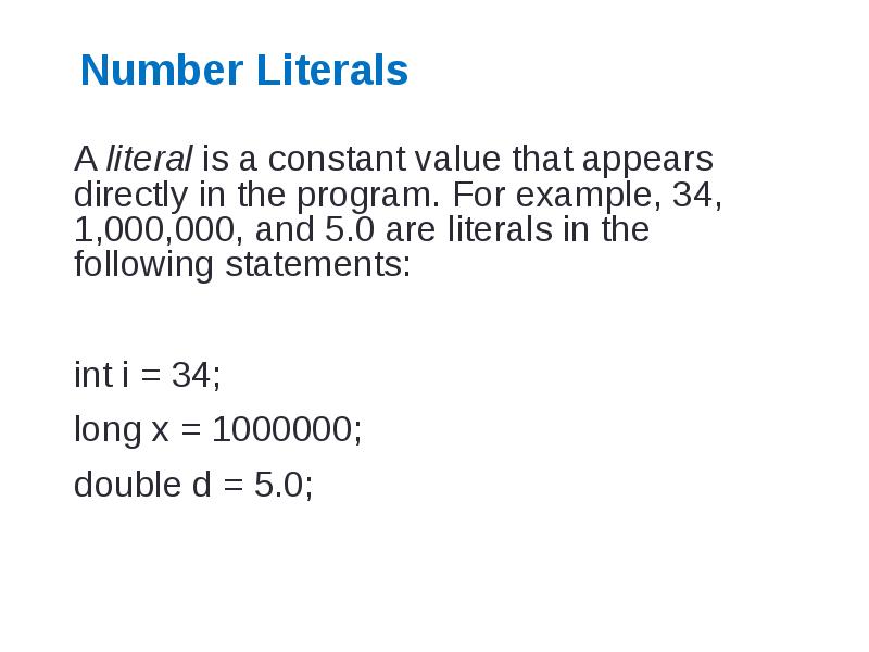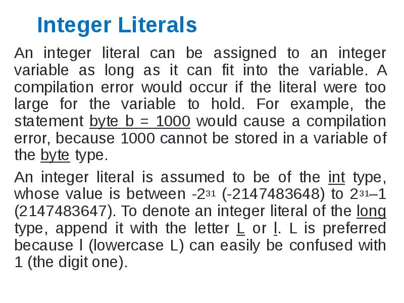 - 22. Integer Literals An integer literal can be assigned to an integer