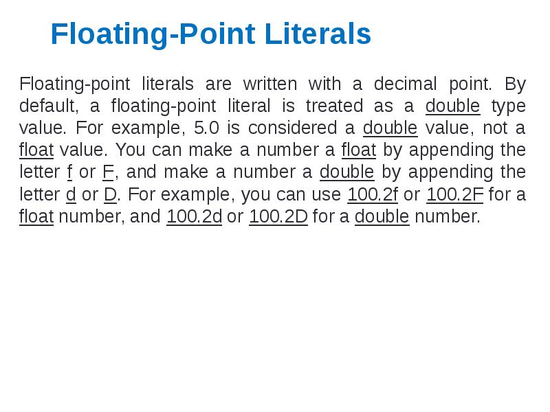 - 23. Floating-Point Literals Floating-point literals are written with a decimal point. By