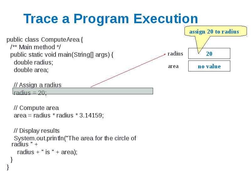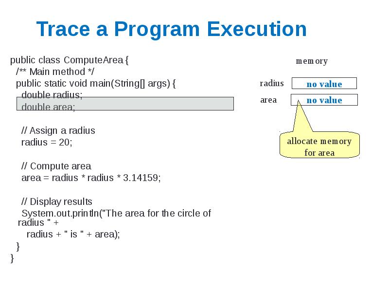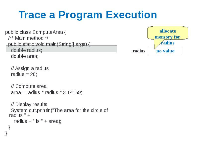 - 8. Trace a Program Execution public class ComputeArea { /** Main method
