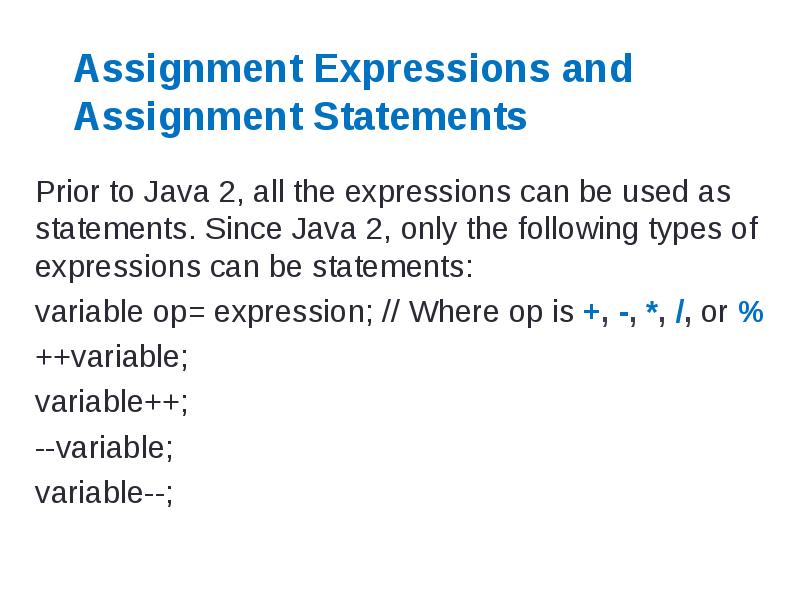 - 33. Assignment Expressions and Assignment Statements Prior to Java 2, all the