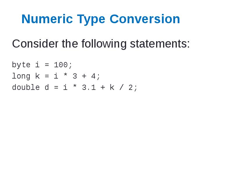 - 34. Numeric Type Conversion Consider the following statements: byte i = 100;