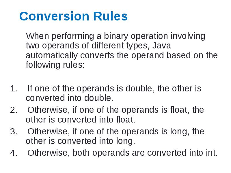 - 35. Conversion Rules When performing a binary operation involving two operands of