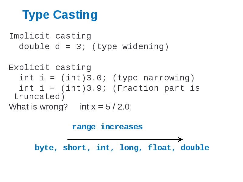 - 36. Type Casting Implicit casting double d = 3; (type widening) Explicit