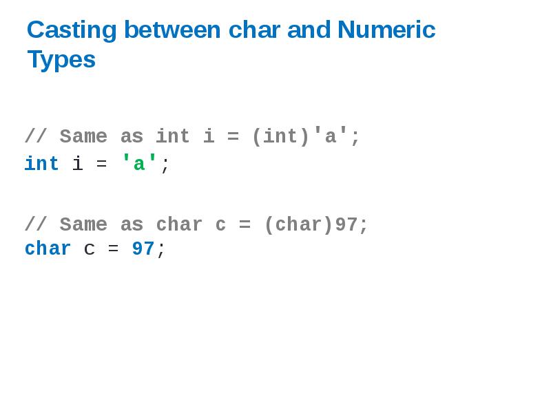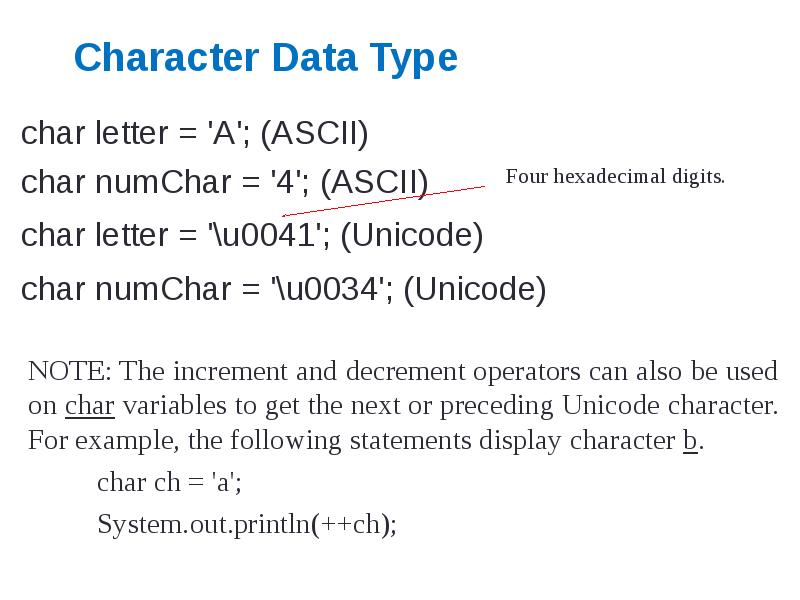 - 38. Character Data Type char letter = 'A'; (ASCII) char
