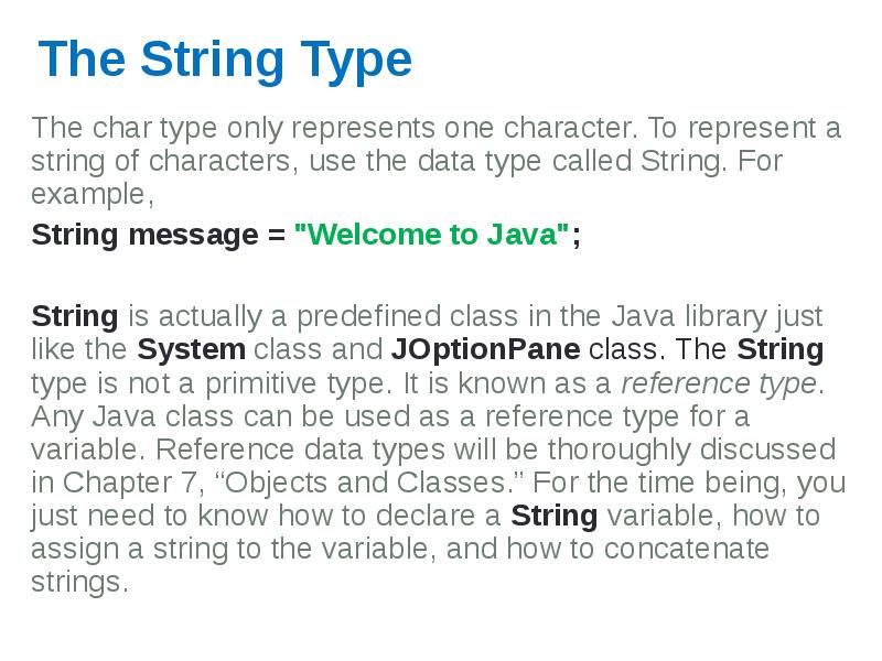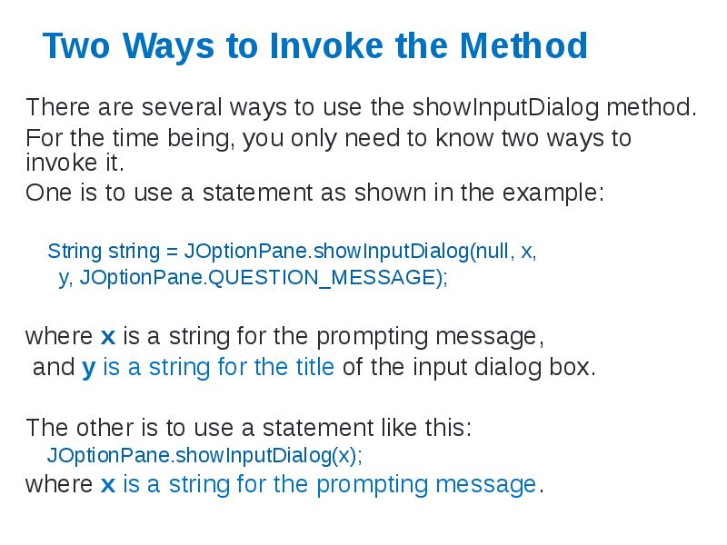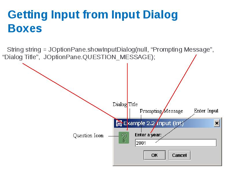 - 61. Getting Input from Input Dialog Boxes String string = JOptionPane.showInputDialog(null,