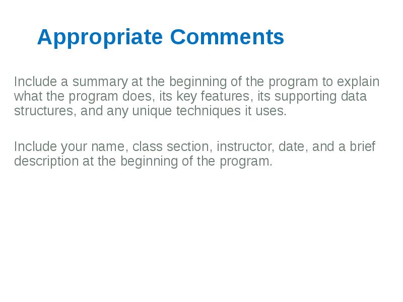 - 48. Appropriate Comments Include a summary at the beginning of the program
