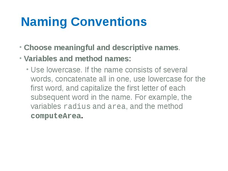 - 49. Naming Conventions Choose meaningful and descriptive names. Variables and method names: