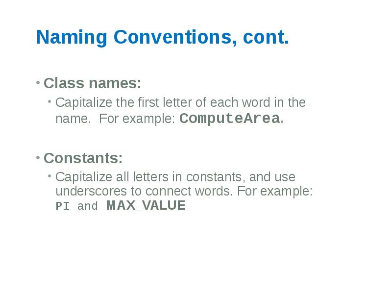 - 50. Naming Conventions, cont. Class names: Capitalize the first letter of