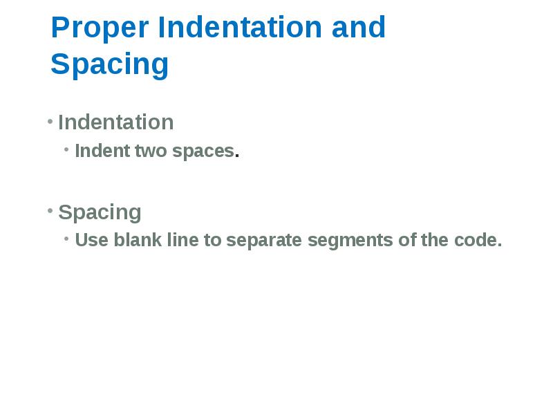 - 51. Proper Indentation and Spacing Indentation Indent two spaces. Spacing Use