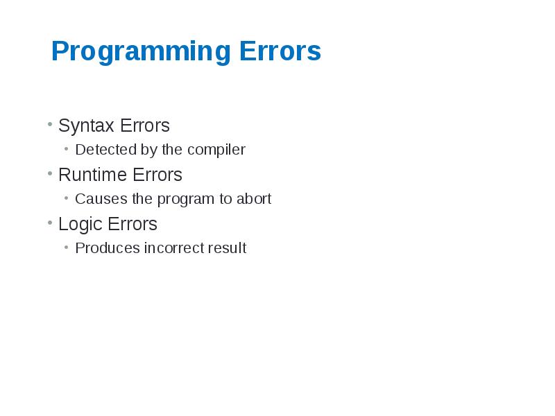 - 53. Programming Errors Syntax Errors Detected by the compiler Runtime Errors Causes