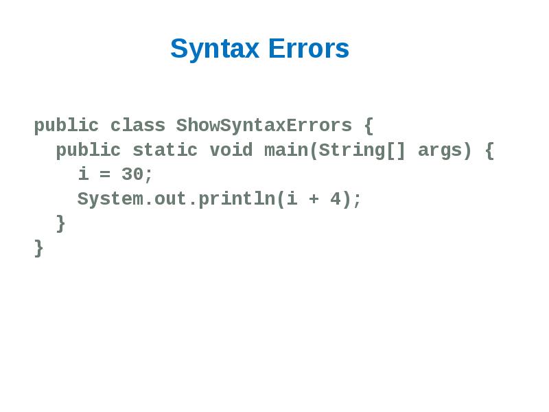 - 54. Syntax Errors public class ShowSyntaxErrors { public static void main(String[] args)
