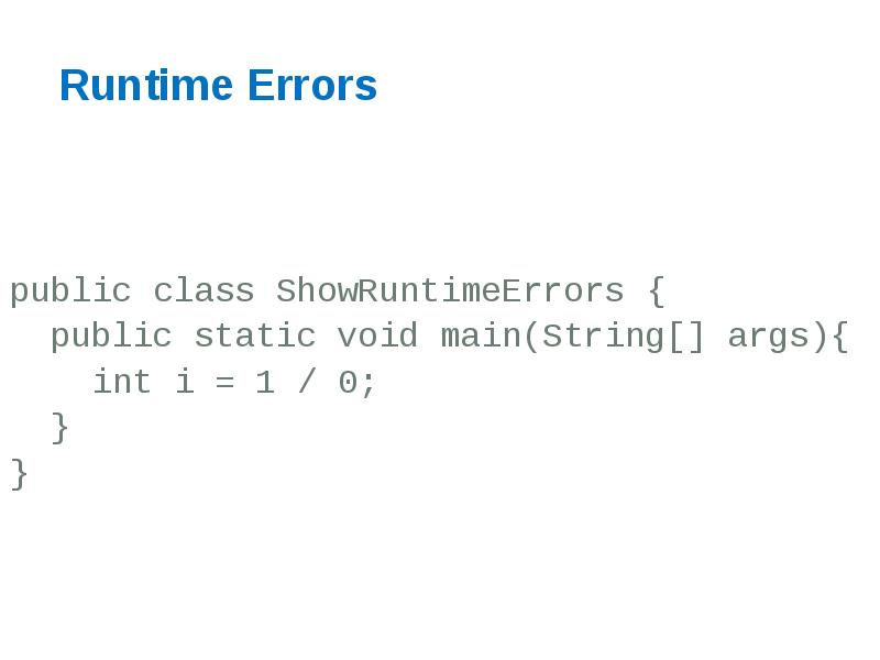- 55. Runtime Errors public class ShowRuntimeErrors { public static void main(String[]