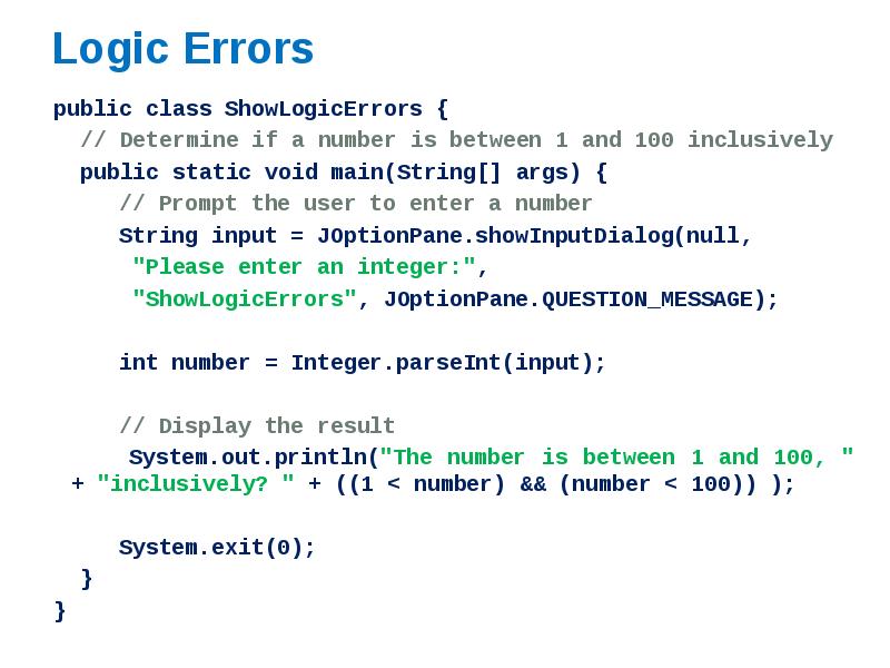 - 56. Logic Errors public class ShowLogicErrors { // Determine if a number