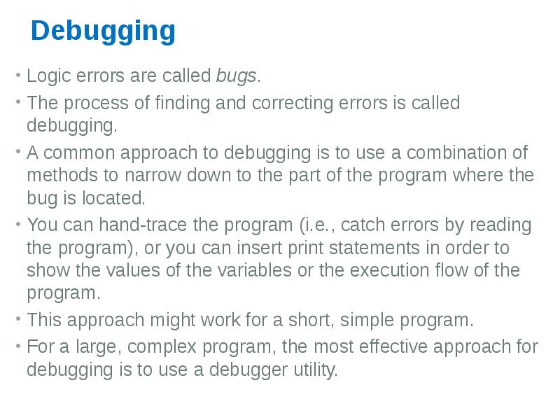 - 57. Debugging Logic errors are called bugs. The process of finding and