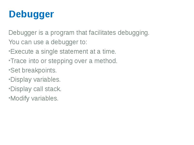 - 58. Debugger Debugger is a program that facilitates debugging. You can