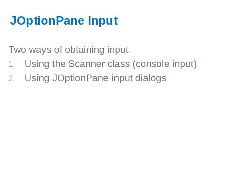 - 59. JOptionPane Input Two ways of obtaining input. Using the Scanner class