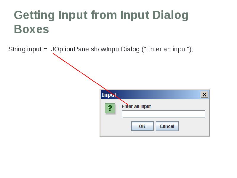 - 60. Getting Input from Input Dialog Boxes String input = JOptionPane.showInputDialog