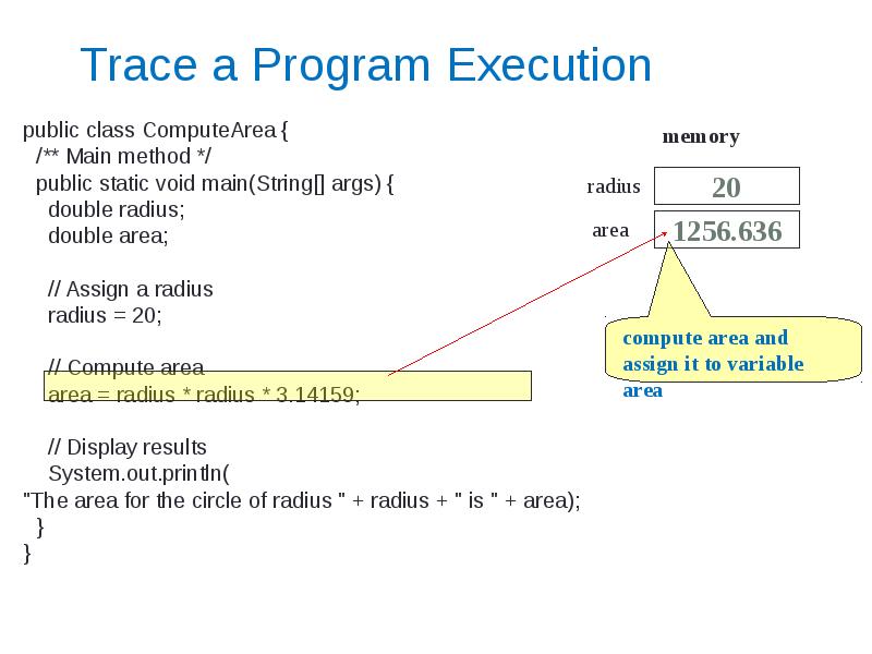 - 5. Trace a Program Execution public class ComputeArea { /** Main method