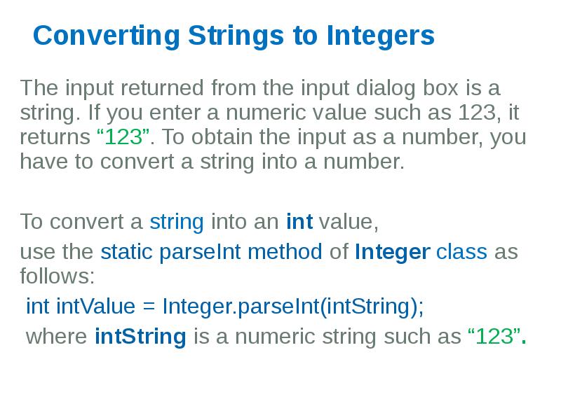 - 63. Converting Strings to Integers The input returned from the input dialog