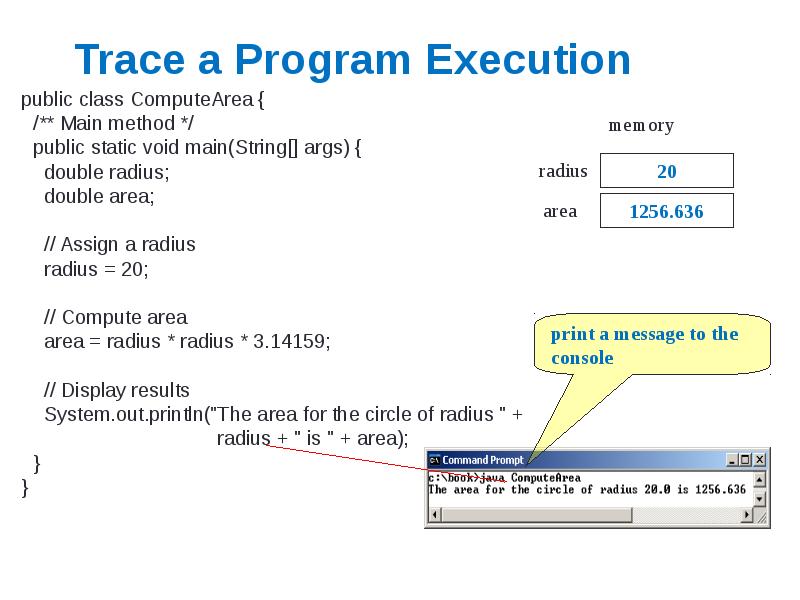 - 7. Trace a Program Execution public class ComputeArea { /** Main method