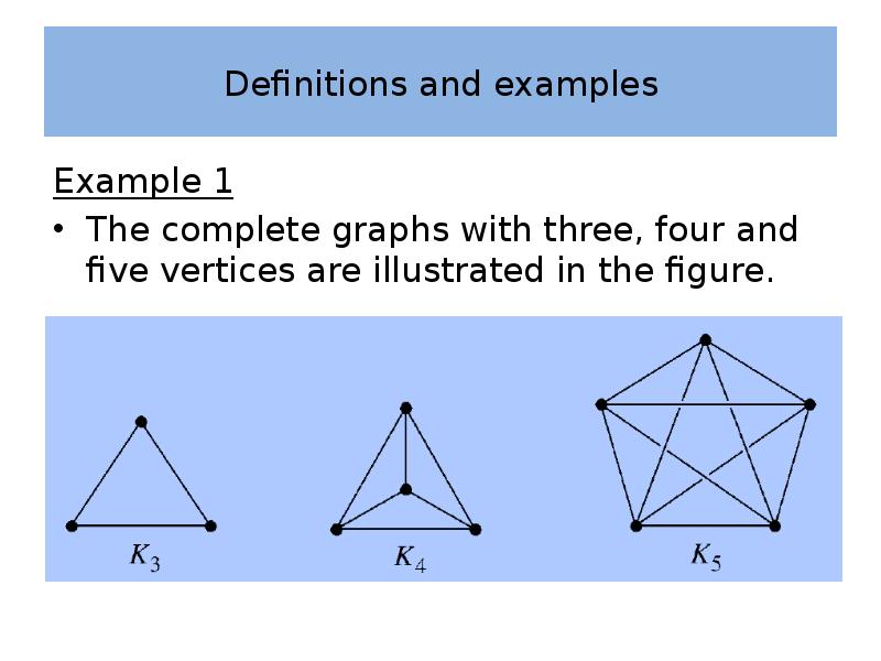 - 20. Definitions and examples Example 1 The complete graphs with three, four