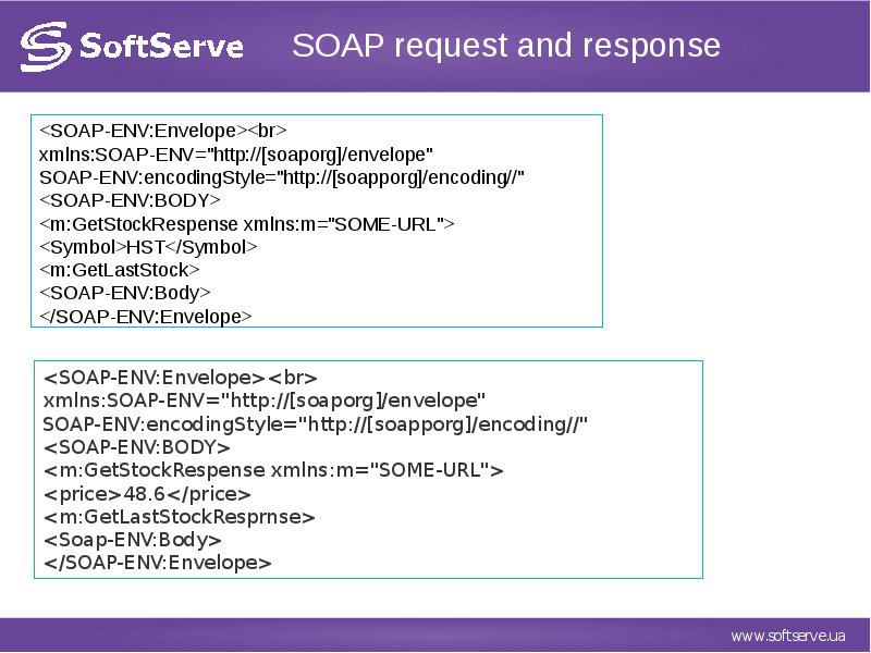 - 10. SOAP request and response <SOAP-ENV:Envelope><br> xmlns:SOAP-ENV="http://[soaporg]/envelope" SOAP-ENV:encodingStyle="http://[soapporg]/encoding//" <SOAP-ENV:BODY> <m:GetStockRespense xmlns:m="SOME-URL">