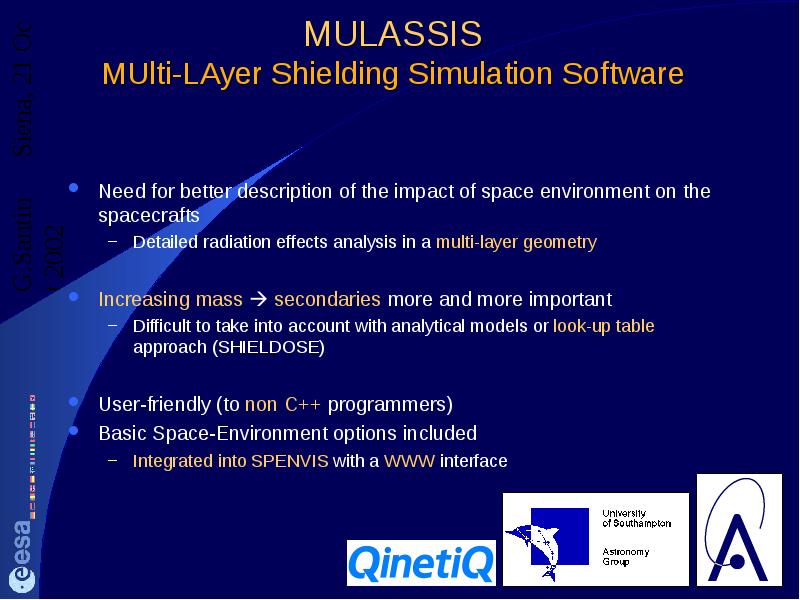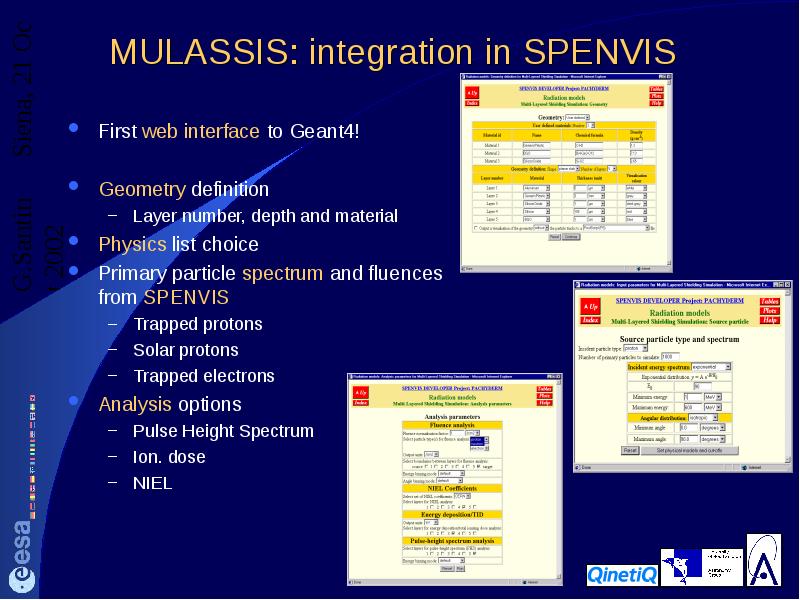 - 11. MULASSIS: integration in SPENVIS First web interface to Geant4! Geometry definition