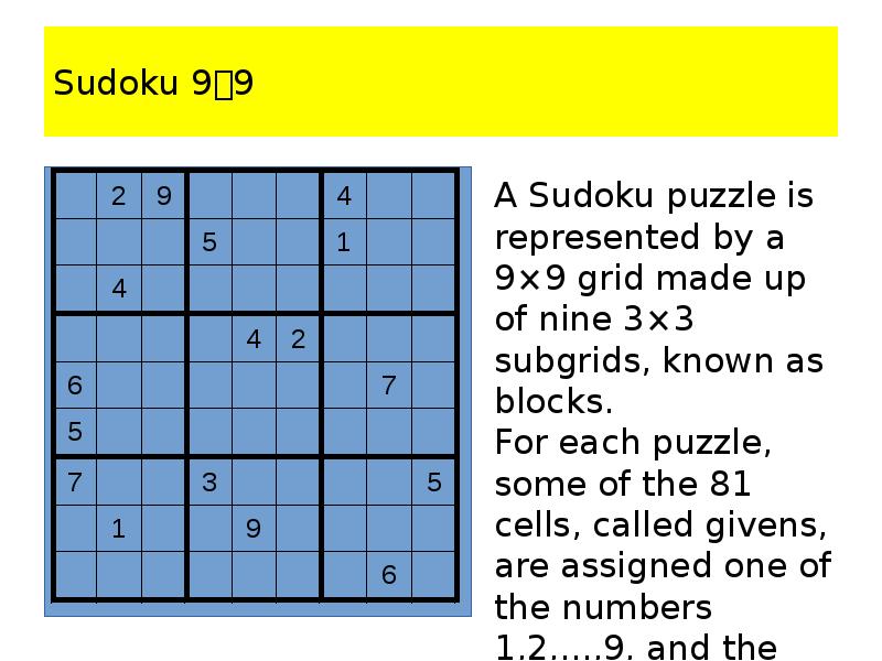 - 102. Sudoku 99 A Sudoku puzzle is represented by a 9×9 grid